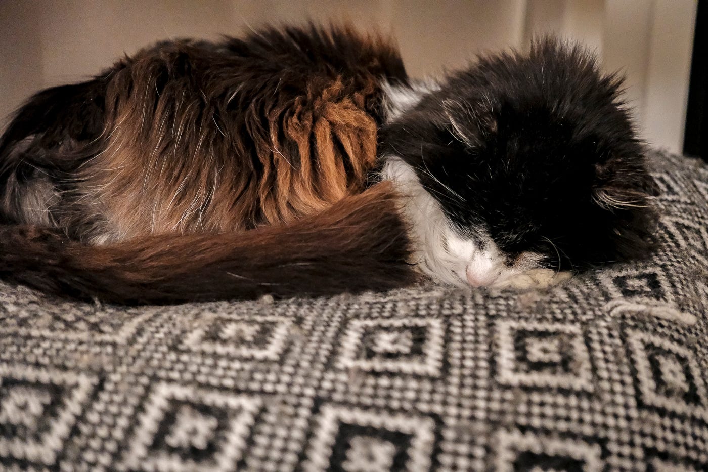 Penny was like this too. When my mom and I went to the humane society to get a kitten, she took one look at the one-eyed cat who was slightly older than the rest, and said, “we have to take her, no one will.” Perhaps my mom, being disabled, felt a kinship with the one-eyed kitten, who clearly had been through something. For the next decade, Penny remained a skittish, scared creature who spent most of her time hiding in the dusty shadows under my mom’s bed, bizarrely finding comfort in hanging off the bottom slats of the bed frame. She rarely approached us for cuddles, and was terrified of visitors.